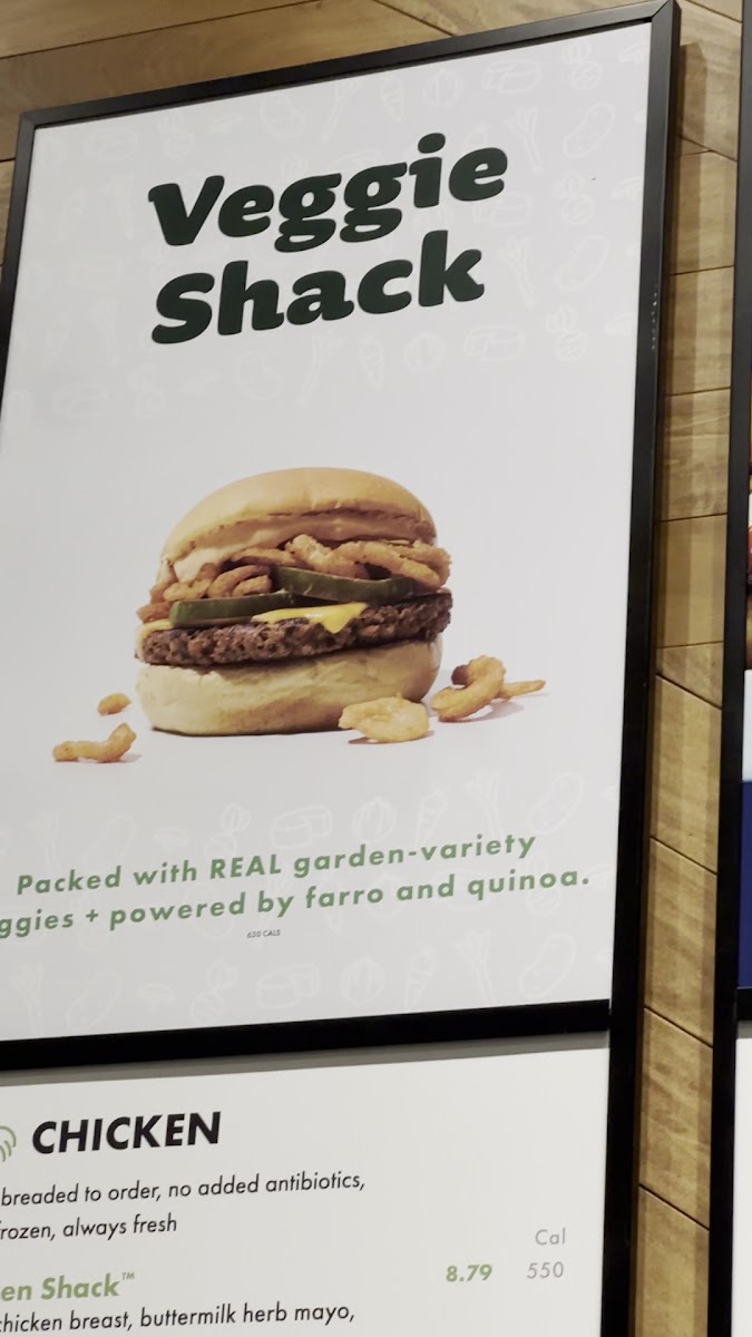 Our veggie burger packed with mushrooms, sweet potatoes, carrots, farro, and quinoa, and topped with American cheese, crispy onions, pickles and ShackSauce (contains sesame, eggs, milk, soy, wheat, and gluten)